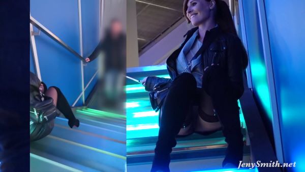 Jeny on a night walk through a city – wearing a short winter jacket, white sweater underneath … the sweater served as an ultra-short micro dress hiding nothing but providing views to her transparent pantyhose underneath – landing strip from in front, butt cheeks from behind. And if you watch the video, try to count how many guys and girls turned their heads – to assure when looking back what they saw (and couldn’t believe) from in front!