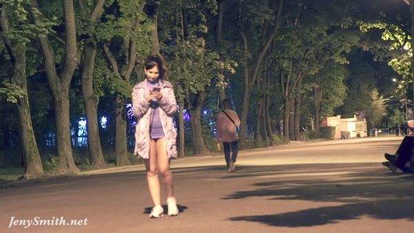 In the beginning, you see Jeny in a fitting room, naked, trying on an ultra-short white mini dress, which Jeny later called T-shirt (worn as a dress). Afterwards, in the mall, she wore her original white mini dress with a front zipper, and she flashed with upskirt views (and no panties, as usual) and opened the zipper to show more of her boobs – what was noticed by passers-by.