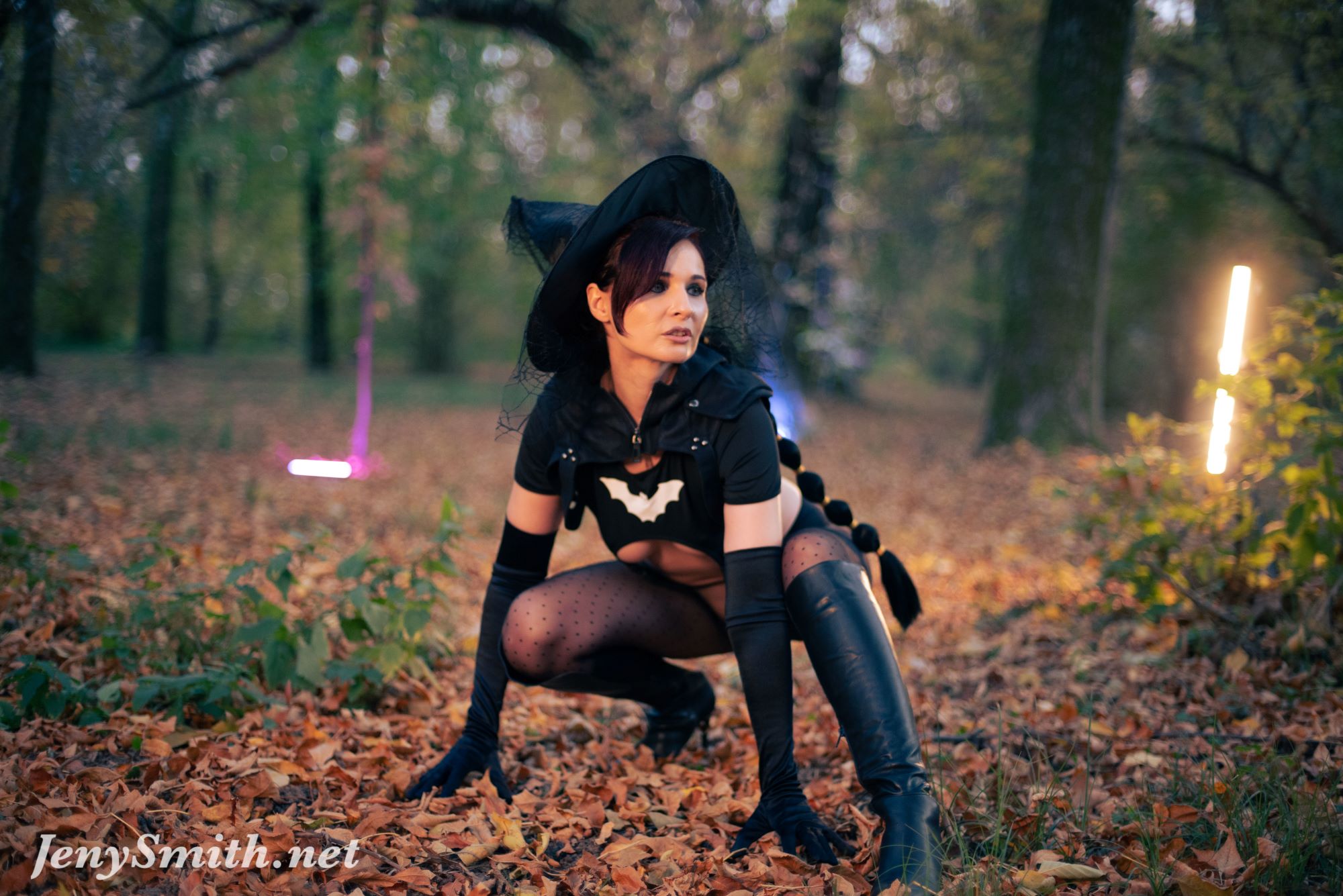 In this outdoor shooting, Jeny wore the hat she used for her first Halloween costume in 2019 and 2020 (see Related Media for these old photosets and an outdoor video), and she combined it with black boots and opera gloves, a very transparent pantyhose with a dotted print and her “batwoman” bodysuit.