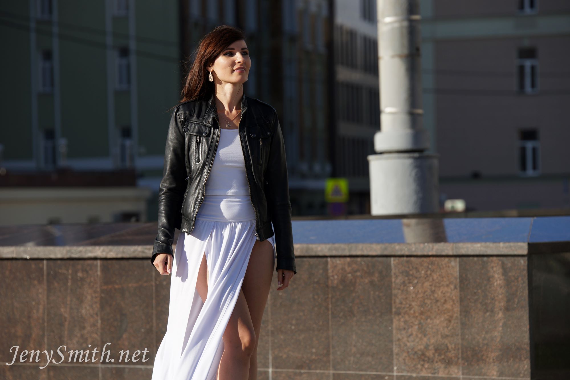 This photoset corresponds to the video with the same name, Jeny is posing in her very long white skirt ... with two very long slits in front, not only showing her gorgeous legs, but also - due to the windy weather - her pussy quite often. And if there was no wind, Jeny herself played with her skirt to flash the public around her.