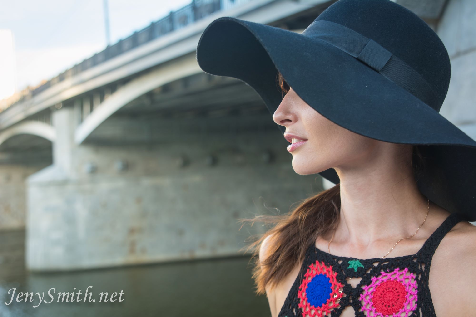 Jeny's photo that has been in the header of her homepage for many years was also taken from this set! Jeny had been shot here from the side, just her head, wearing a hat, eyes hidden by the hat, only nose and mouth visible, a bridge in the background.