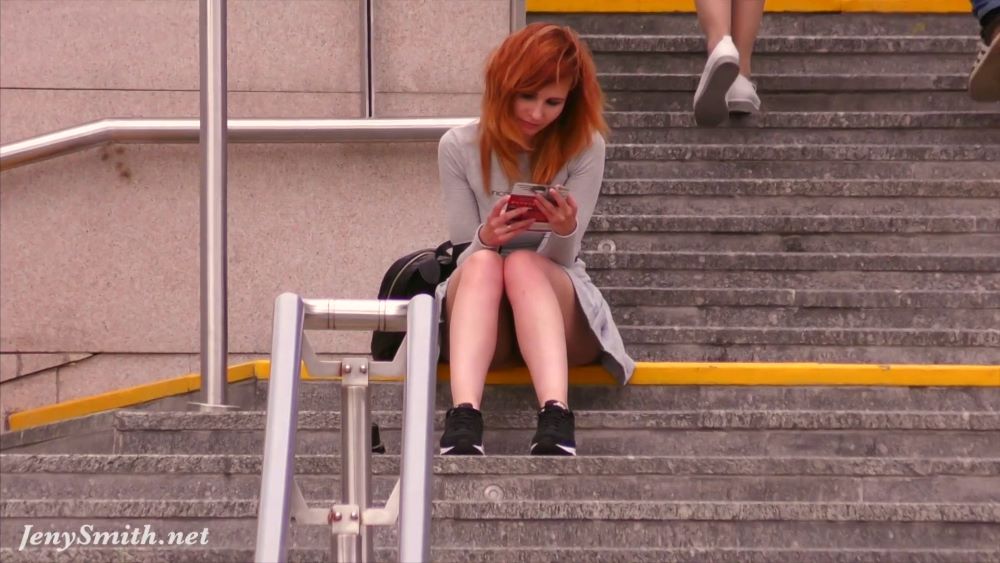 In the city, Jeny started to read something, sitting on stairs, stone steps, or wooden benches. Alex filmed it from some distance, Jeny added upskirt close-ups with her camera on a tripod, next to her feet.