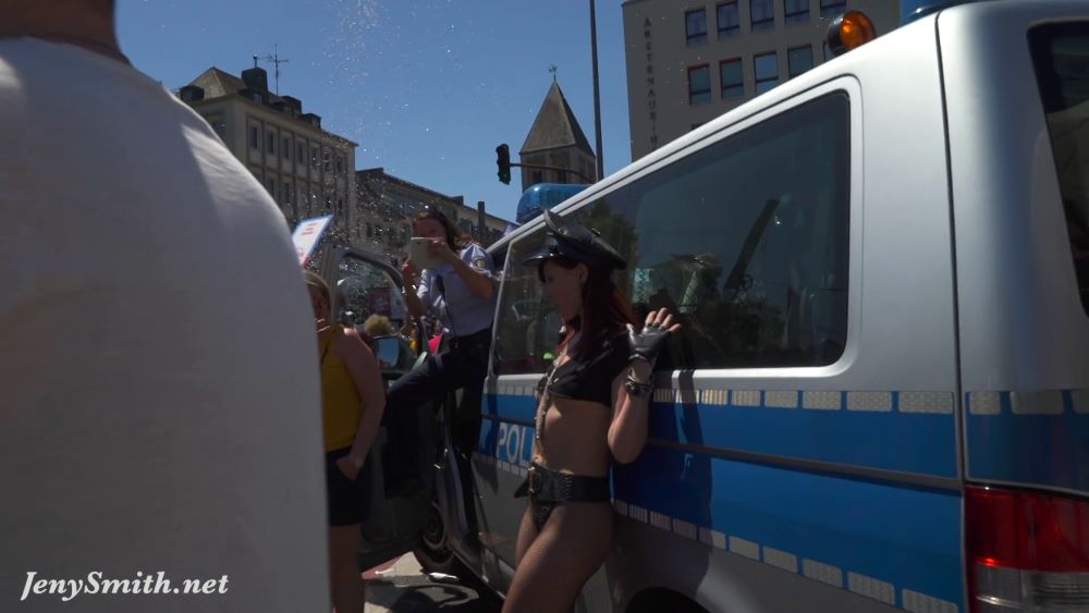 Jeny participated in a pride parade, taking place in Cologne. She was wearing a very open outfit, a huge black “rock star” cap, an ultra-short top covering half of her boobs, a see-through fishnet pantyhose … and a tiny piece of black fabric under the pantyhose to cover her pussy.