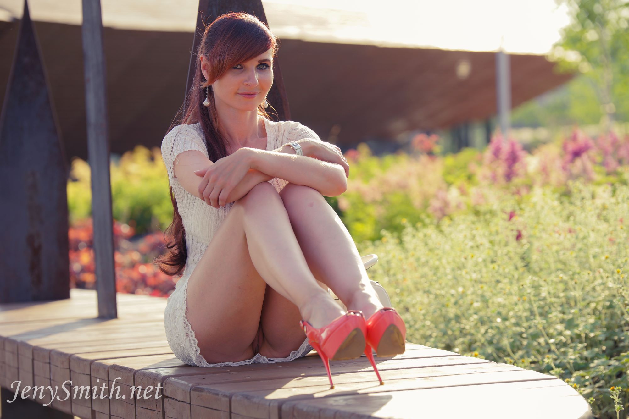 These photos are from a summer walk of Jeny, in a mini dress, a bra beneath, but no panties. Jeny is walking and posing in a park, she is sitting in the meadows or on a bench, standing and posing on outdoor stairs, giving the viewer a lot of upskirt views to her pussy. At the end, she is even lying on a bench, lifting a leg ..