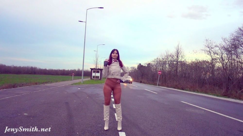 The outfit is exciting. Jeny stops along the road. She takes off her skirt then her jacket. Her tits, pussy and ass are very visible in this bodysuit. Jeny comes and goes like this on the road. Cars passing and honking. Jeny will tell us later, while watching her video, that she didn't think her butt was so visible. But she really liked it. (JJR)