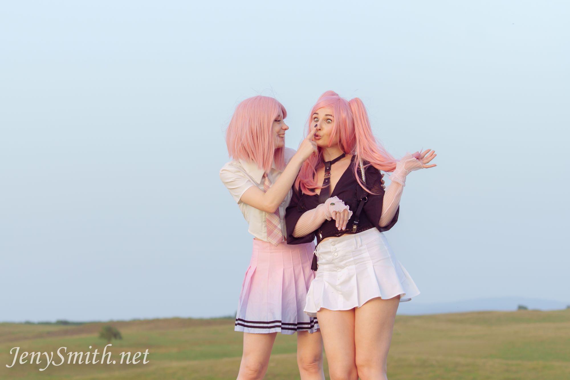 Jeny and Astra met for a picnic in early summer. Both in pastel colours, light pink, light blue, white, Jeny also with black top – but in general both in “JenySmithCho” outfit with light pink wigs! They unfolded a blanket in the meadows, equipped with beverages and food, they sat down and teased each other with cherries, inspected a beetle, teased each other’s noses. What should be a SFW photoset, non nude, wasn’t really one at the end: ...