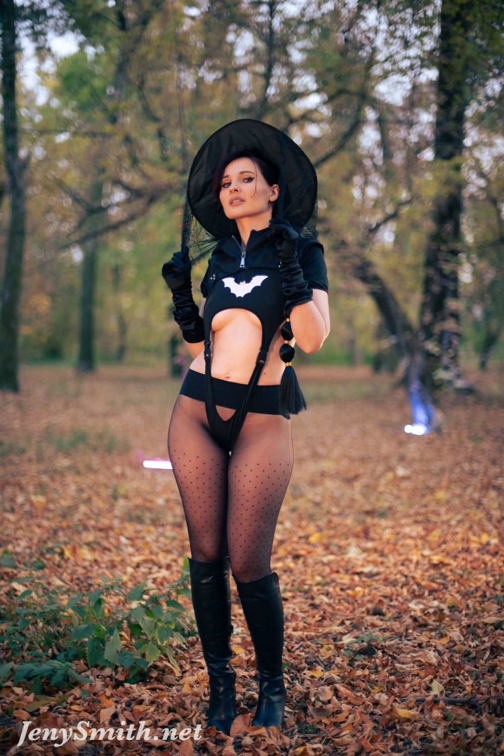 In this outdoor shooting, Jeny wore the hat she used for her first Halloween costume in 2019 and 2020 (see Related Media for these old photosets and an outdoor video), and she combined it with black boots and opera gloves, a very transparent pantyhose with a dotted print and her “batwoman” bodysuit.