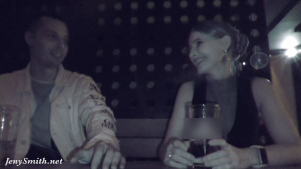 Jeny met Nsh again. They first met when Nsh applied to participate in a “Hairdresser tutorial”, and he realized that Jeny enjoyed to tease her clients by getting naked. Jeny invited him for a date afterwards, to show him some of her videos in her office. Both videos have been some of the most exciting ones in 2025 (see “Related media” for links to both). But Nsh saw Jeny’s outdoor or in-office videos with Jeny getting naked, using butt plugs, masturbating, even having anal sex with Alex … but what he didn’t know was for what type of videos Jeny became famous: flashing and teasing and undressing in crowded bars, on crowded parties … and when Jeny and Alex met Nsh in a bar, he learned about that, and he practiced sitting next to the Queen of Tease: Jeny teased him by undressing her vest to show her see-through top. And she led his hands to her naked legs – no underwear underneath the short skirt …