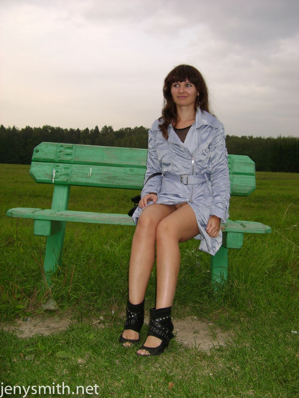 Jeny in one of her earliest photosets, outdoors in a light blue coat, a very sheer fishnet mini dress, black shoes – posing on a bench, on a street, in the woods or lying in the meadows. Jeny mentioned that before her pregnancy she had a slightly different body shape – enjoy the very young Jeny in this set, and try to realize how beautiful she is today!